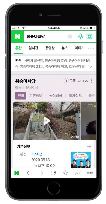 다음의 경우와 거의 동일한 방식입니다. 네이버에서 "뽕숭아학당"으로 검색하면 가장 먼저 해당 방송 정보가 나타납니다.